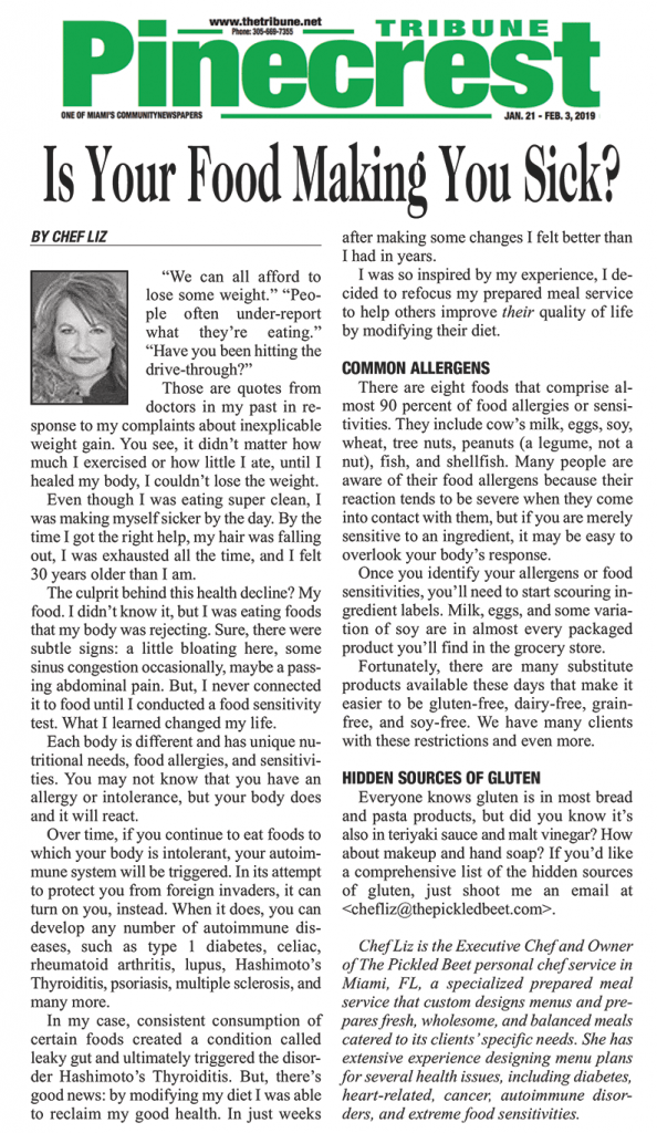 To read the article in Pinecrest Tribune, click on the reader below to open and you’ll find the article on page 26. If you would like more information on how The Pickled Beet can help you manage your overall health through food, contact us.